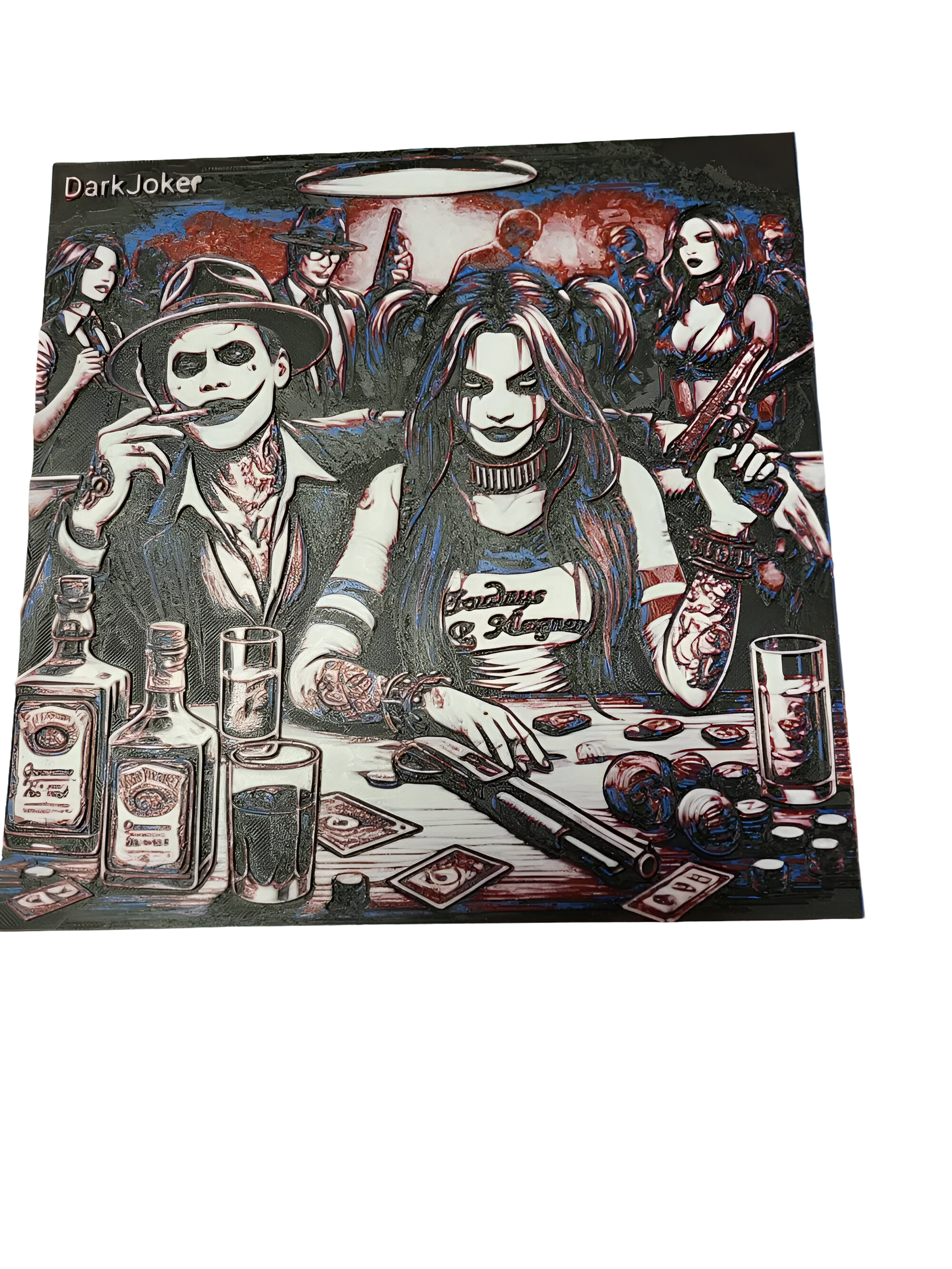Dunkel, rebellisch und voller Kontraste: Dieses 3D-gedruckte Kunstwerk zeigt den ikonischen Joker und Harley Quinn in einem modernen Street-Art-Design. Die intensive Farbgebung in Rot, Blau und Schwarz macht das Bild zu einem echten Blickfang – ob im Wohnzimmer, Gaming-Raum oder in der Bar.